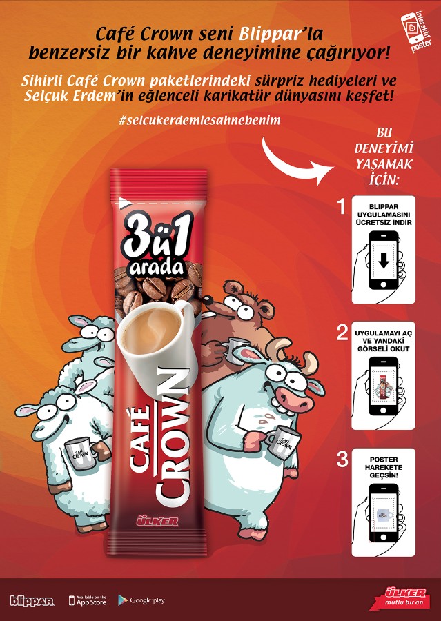 Blippar uygulamasını indirip, yukarıdaki görsele ya da herhangi bir Cafe Crown logosu / ürününe QR kod okutur gibi tutmanız yeterli.