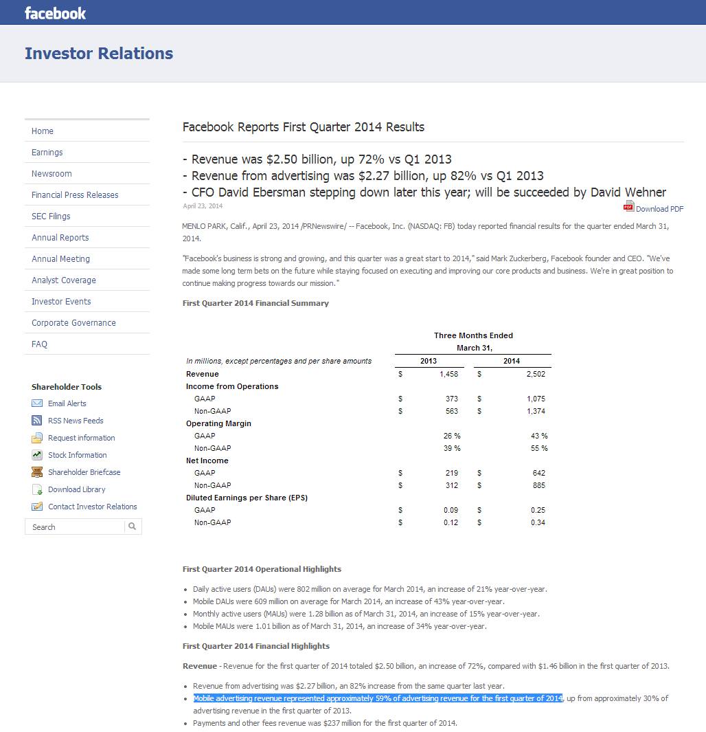 Mobile advertising revenue represented approximately 59% of advertising revenue for the first quarter of 2014