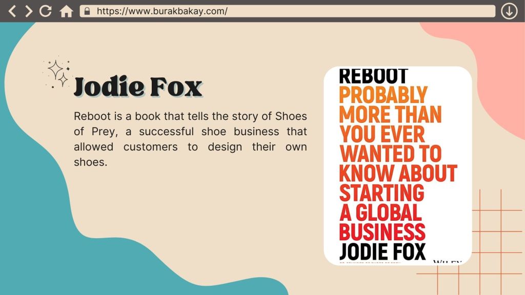 “Reboot” is Jodie Fox’s memoir of her experiences as an entrepreneur building a successful shoe business called Shoes of Prey. She provides valuable advice on navigating the challenges of building a global business and emphasizes the value of owning a business, even if it fails.