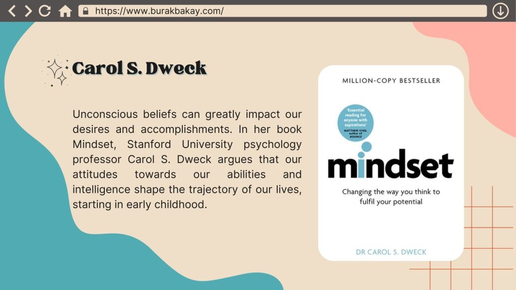 Unconscious beliefs can greatly impact our desires and accomplishments. In her book Mindset, Stanford University psychology professor Carol S. Dweck argues that our attitudes towards our abilities and intelligence shape the trajectory of our lives, starting in early childhood. Dweck, a Yale Ph.D. holder, is a decorated researcher in social and developmental psychology.