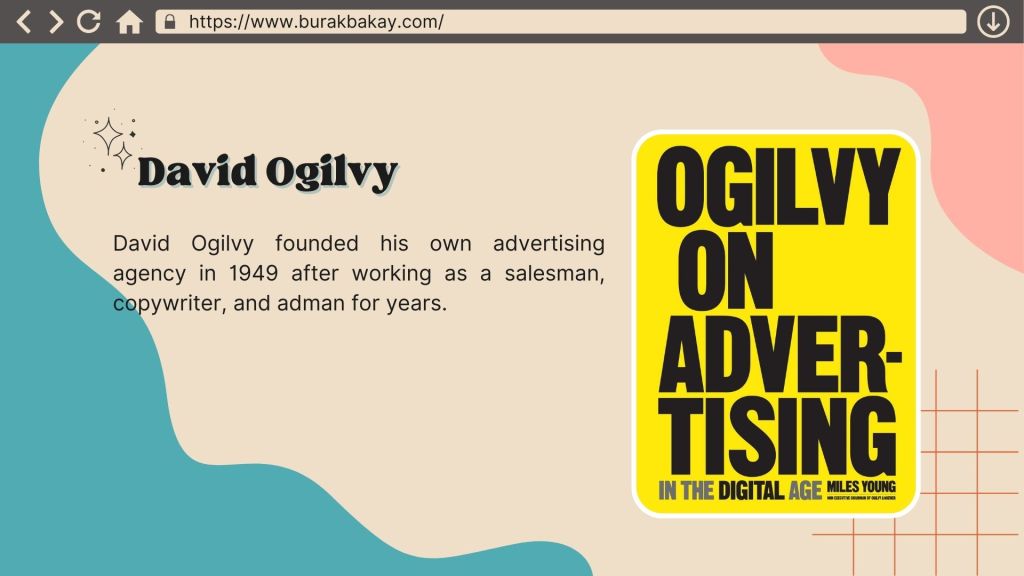 d his own advertising agency in 1949 after working as a salesman, copywriter, and adman for years. His agency became one of the world’s most successful, and in 1985, he wrote Ogilvy on Advertising, a comprehensive guide to marketing, creating effective ads, and the industry as a whole.
