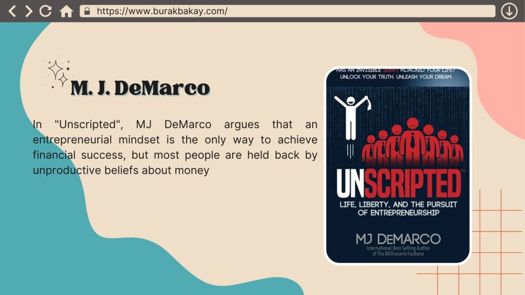 In “Unscripted”, MJ DeMarco argues that an entrepreneurial mindset is the only way to achieve financial success, but most people are held back by unproductive beliefs about money. He offers practical solutions to remove these beliefs and cultivate an entrepreneurial mindset.